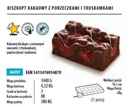 Kakaowy biszkopt z czerwonymi owocami: z truskawkami, porzeczkami i malinami. Jedna sztuka to 21 porcji produktu
