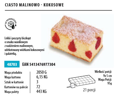 Lekki i puszysty biszkopt o smaku waniliowym z nadzieniem malinowym, udekorowany wiórkami kokosowymi i galaretką. Jedna sztuka to 21 porcji produktu